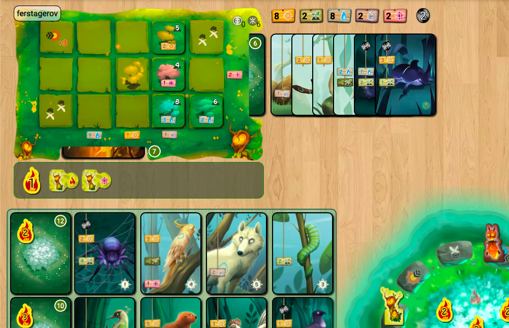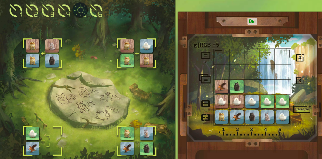 В игре у нас есть колода животинок с разными мастями. Мы тянем оттуда карты до тех пор, пока не захотим остановиться. Но если достали три черных злых животных, то игра заставляет остановиться насильно. Что-то типа Шарлатанов. На вытянутых картах есть символы ресурсов, мы их считаем и за них как за валюту делаем до двух действий. Действия разные — от тушения пожаров в лесу до засаживания свой планшет растениями. Каждое из возможных действий так или иначе двигает вас по одному из победных трэков. Как только кто-то набрал на одном из них определенное число, игра заканчивается и игрок объявляется победителем. То есть это по сути игра-гонка, но бежать можно в разных направлениях.