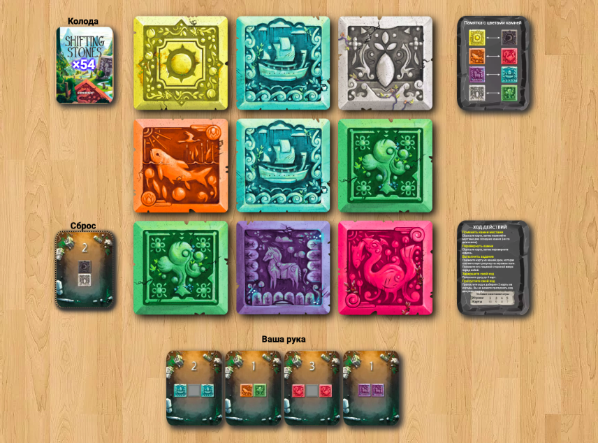 Довольно простой абстракт. Опробовал его онлайн на BGA до кучи, так как читал о нем парочку положительных отзывов. Ну, ничего сверхвыдающегося не увидел. Игра рандомна, и рандом этот не сказать, что бы элегантен. Думать приятно, но, в общем и целом, абстрактный проходняк. На больше чем двух игроков будет вообще скорее всего лютый хаос. В игре мы сбрасывая карты с руки двигаем и переворачиваем карты, чтобы совпадали с узором на других картах на руке. За это получаем очки. Что на руках у соперника не знаем и вполне может своими мувами помочь другим победить.