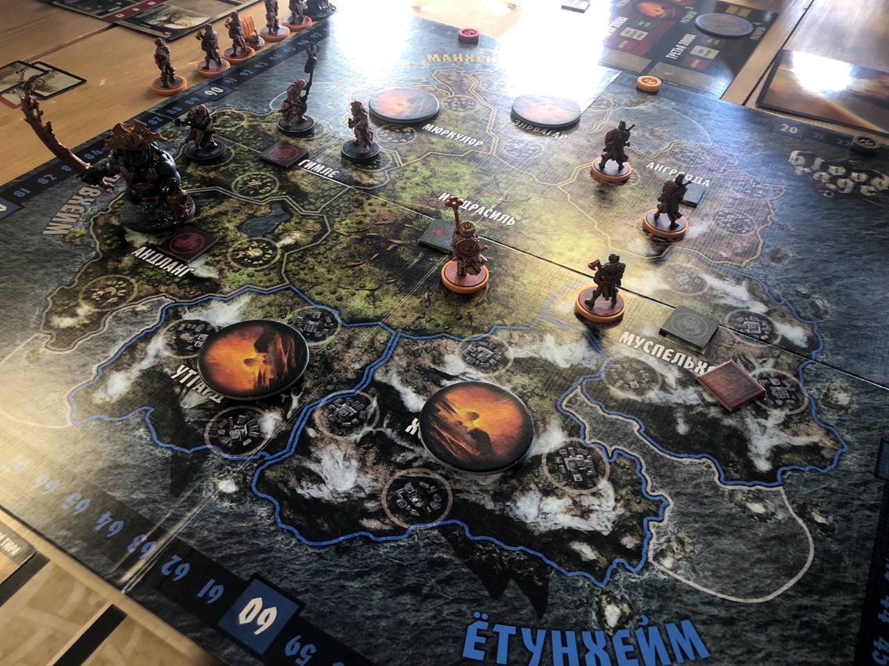 Все никак не сыграю с допами или с альтернативными монстрами, чтобы посмотреть на альтернативные стратегии. Увидел игру на BGA, и решил тряхнуть стариной в голую базу. Уделал каких-то высокорейтинговых ребят через стратегию Локи и был таков. Не знаю, зачем они мне отдали на драфте все карты Локи и монстров, которые за ноль выставляются. Игра все еще приятная, и все еще хочется попробовать сыграть в нее с допами, потому что базовые стратегии и варианты развития событий я за свои 30+ партий наизусть уже знаю. А фото с недавней партии ребят из клуба. Я в это время в Рококо играл.