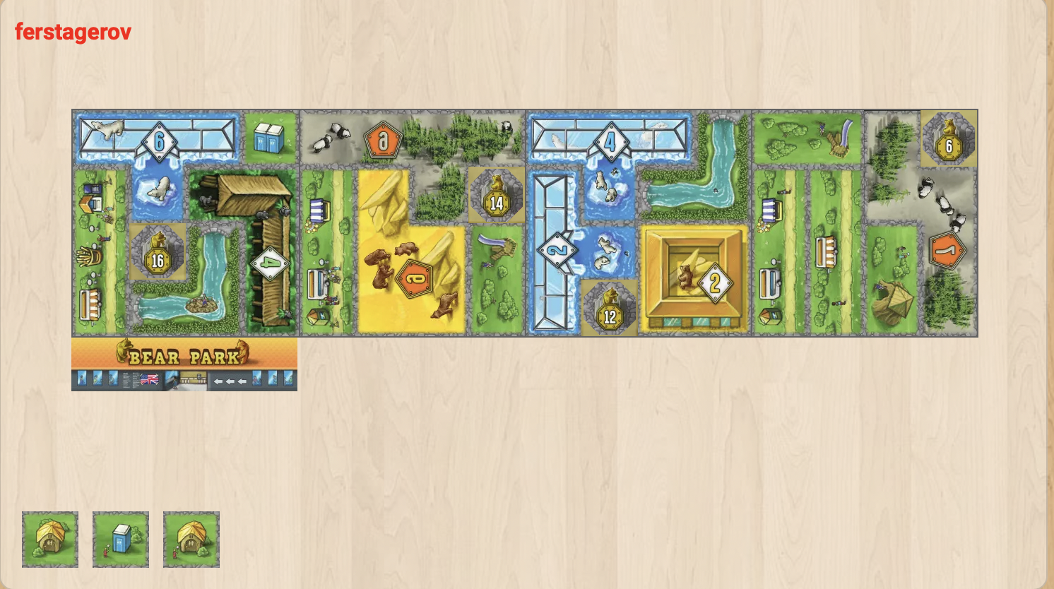 Из всего опробованного онлайн, пожалуй, выделю только медвежий парк. В игре мы постепенно строим и заселяем, как ни странно, медвежий парк. Задача делать это эффективнее и где-то чуть быстрее, чем соперники, выкладывая на свои тайлы парка тетрисообразные здания. Часть зданий в игре приносит победные очки, и при этом чем раньше ты это здание взял, тем больше очков. Часть зданий очки не приносит и только дает возможность взять что-то еще. Ну и когда ты застраиваешь все кроме одной клеточки, ты берешь статую. Опять, чем раньше застроил, тем больше очков получил. Вот, в общем-то и все. Как пэчворкообразная игра после теста онлайн она даже могла бы стать претендентом на попадание в коллекцию, потому что Аня такое любит. Но тут подкачало оформление, чтобы я ее покупал. Выглядит игра, как по мне, устаревше. Ну а играется для своей весовой категории вполне себе неплохо. Играл на BGA.