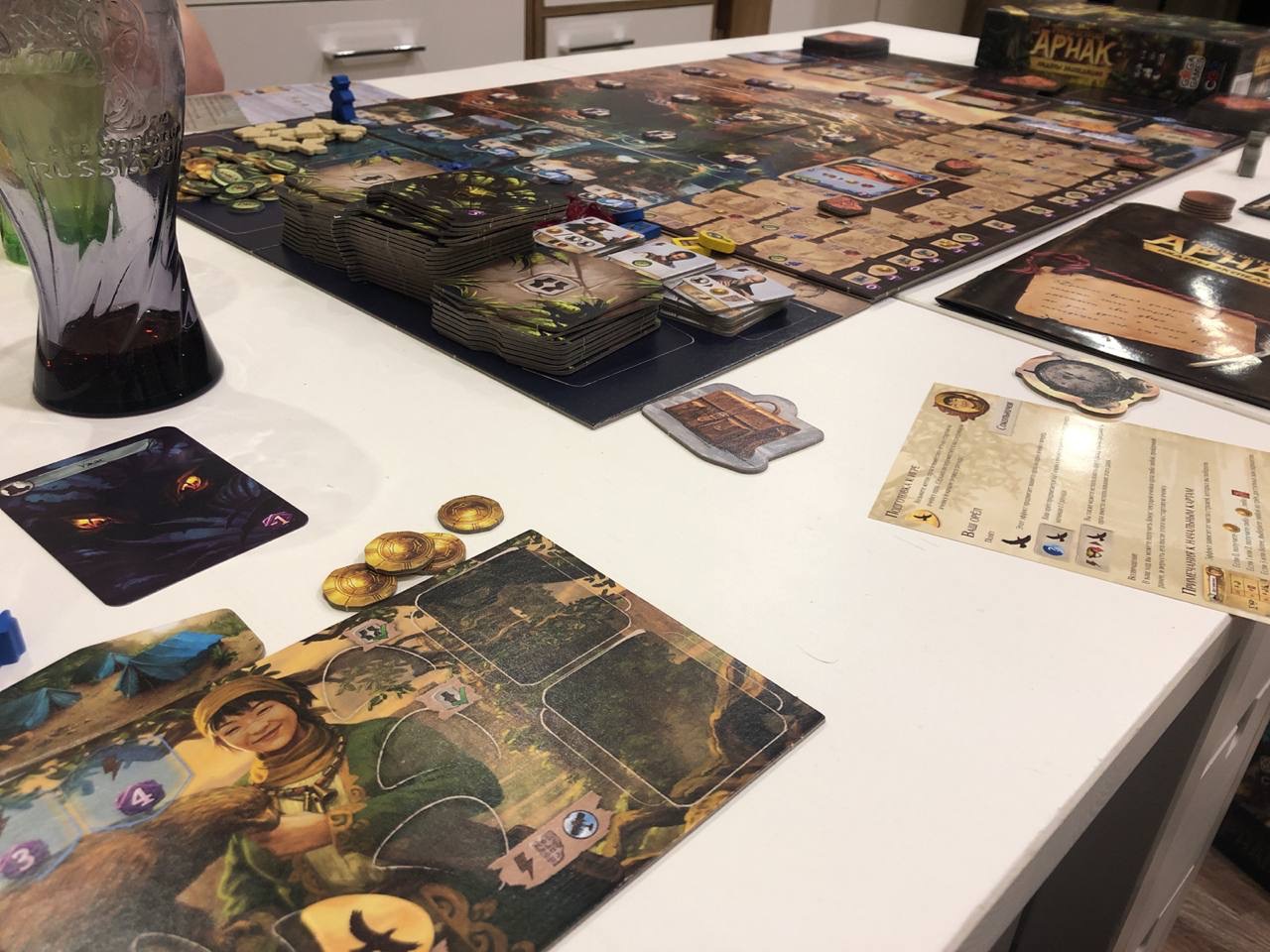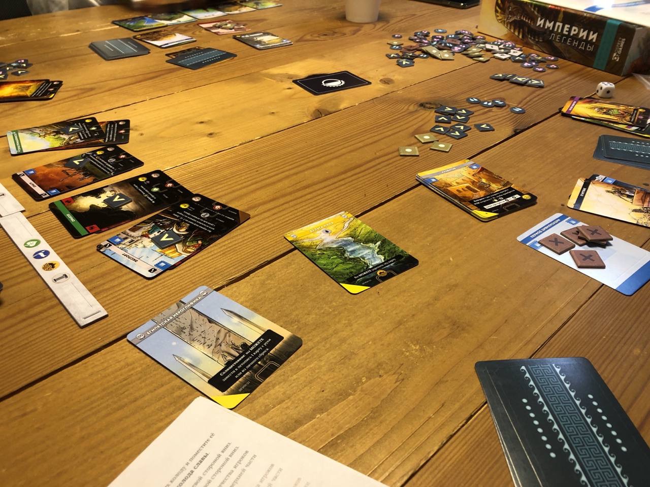 Сыграли пробную партию за Маори и Египтян, достаточно долго разбирались в каких-то нюансах правил и всю игру я что-нибудь искал в рулбуке. Но и не смотря на это игра достаточно быстро вовлекла, и строить свою карточную цивилизацию было очень интересно, как мне, так и Ане. Играли мы кстати вдвоем, но ощущение что играли соло. На действия друг друга обращать внимания было сложно, и взаимодействия было почти чуть чуть: Аня иногда ломала мне слонами мой Нил, а я ей… говорил добирать карты с колоды. Это было немного странно, что она может мне вредить, а я ей нет, но да ладно. Еще из неудобного, в конце игры было очень сложно посчитать победные очки — они и там, и тут и там, так что надо почитать как это делать более удобно. Но в остальном игра очень заинтересовала, хочется в ней разобраться и поиграть за каждую из 8 фракций. А вот покупать ли вторую коробку, пока не знаю. Пока воздержусь, фракции в Легендах выглядят поинтереснее.