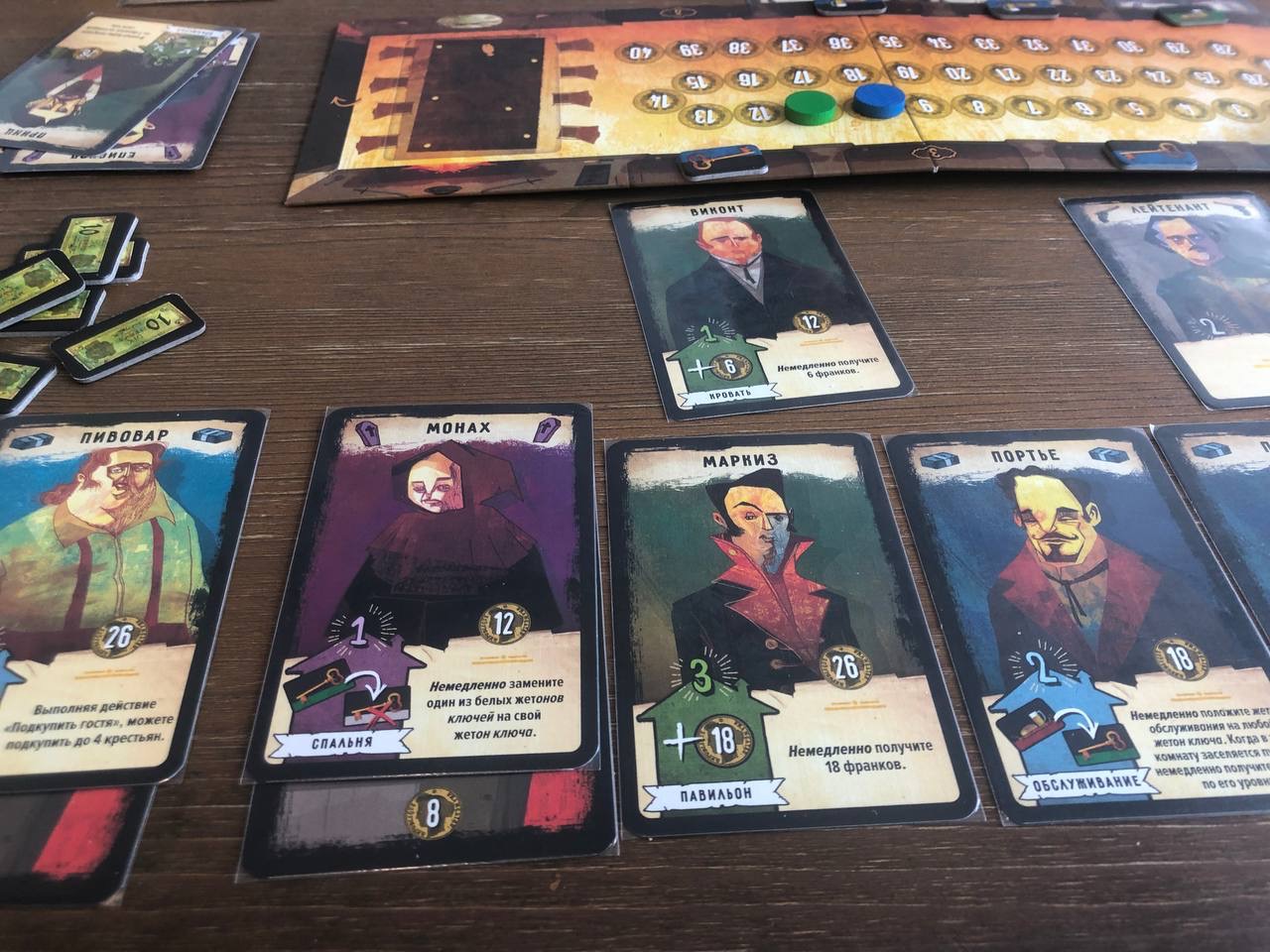 Давненько мечтал сыграть в нее, но вживую сделать это сложно — играть лучше небольшим составом, а покупать вслепую не хочется, ценник кусается. Но вот она появилась онлайн и я все-таки до нее добрался. Ну что сказать, перед нами вполне себе неплохое евро, не такое просчитываемое как у Ласерды, но вполне себе симпатичное по механикам. Оформление на любителя, рандом по выходу карт, целей и тайлов комнат присутствует, но не смотря на это играется вполне себе интересно. В игре мы управляем особняком, в которой есть прислуга (миплы) и в котором мы строим и активируем разные комнаты. Как правило для активации комнаты нам нужна определенная прислуга, а также карты гостей — которые дают определенные плюшки при розыгрыше. Гостей и комнат много, свойства разные, вариантов добыть победные очки в принципе хватает, возможности завести себя в кризисную ситуацию в принципе тоже можно. На двоих-троих игра действительно играется как по мне очень приятно, но покупать не буду. Все-таки для своего геймплея как по мне игра дороговата. По возможности опробовал бы также допы. На фото из интернета — как игра выглядит вживую.