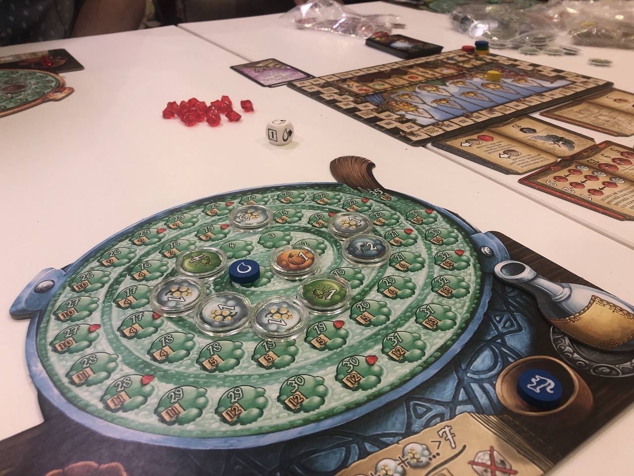 Каждый игрок имеет своей кусок карты, где застраивает все зданиями. По мере игры открываются новые типы здания. Если в чартерстоуне надо было клеить наклейки, то тут с помощью королевского вантуза мы достаем один тайл и вставляем другой. Здания обладают абсолютно разными эффектами, делающими геймплей разных игроков ассиметричным. Но базово игра является кубоплейсментом: в начале каждого раунда вы швыряете свои кубы и размещаете их по очереди на действиях. Само собой можно друг друга подрезать так как слоты ограничены. Ну и сами кубы прокачиваются по мере кампании с помощью новых наклеек на грани. Кроме этих механик в игре есть и куча других: например можно ходить мужичком и собирать травы (пуш-е-лак) или нанимать рабочих из мешка, у каждого из которых есть свои свойства.