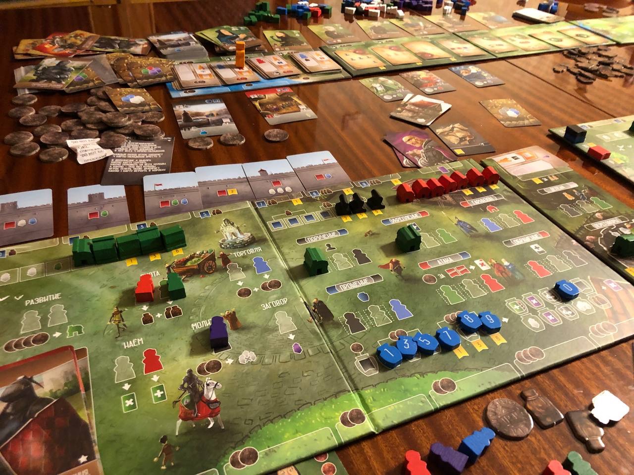Не прошло и года, как игра с дополнениями доехала. Вот только мы к этому моменту уже забыли, почему ее вообще купили. Забрал я эти увесистые небольшие коробки и поехали мы в праздничный тур по родственникам. Стали раскладывать Паладинов, третьей за стол подсела Анина мама (не-настольщик, сложнее чем в бумажные кварталы ни во что не играла). После воспоминания правил базы и узнавания правил допа начали играть и как-то все довольно бодро завертелось. Выбирать миплов на раунд интересно, длительности игры хватает чтобы выполнить и перевыполнить многие цели. Я недооценил колоду чужеземцев, не брал их и в итоге проиграл по очкам. Анина же мама к середине партии уже вовсю строила стены и заставы, что всем нам однозначно должно сказать, что у игры нормальный порог вхождения, можно играть даже с не настольщиками. Кстати на троих еле-еле смогли все уместить на большом столе, и то горожан пришлось дополнительно держать в руках, не влезли.