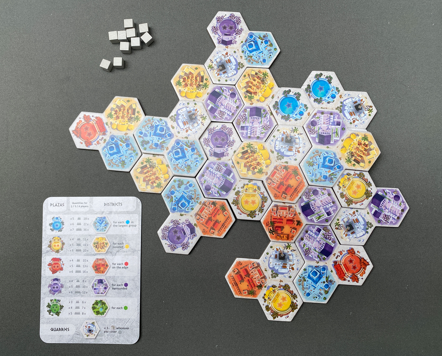 В игре мы выбираем и аттачим к своему городу разные тайлы. В каждом тайле 3 гекса. А на гексах разные кварталы, всего их 6 типов, пять из них приносят победные очки, но по-разному. Какой-то тип должен быть окружен. Какой-то нужно размещать рядом. Еще тайлы можно наслаивать друг на друга, тем самым получая больше победных очков за кварталы. Сами очки тоже не берутся из воздуха, к каждому цвету нужно еще строить множители, и желательно повыше. Возможно, это звучит как неплохая пространственная головоломка, но я не увидел в игре ничего такого, что не может предложить мне условные Лоскутные королевства, особенно в версии Истоки.