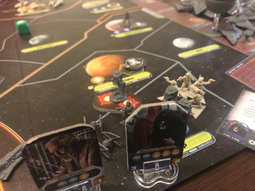 В игре за Империю играл против самого неопытного игрока моей группы, и, возможно, из-за этого игра прошла по моему плану. На расстановке юнитов я получил 4 системы в одной части карты и лишь одну во второй. Закинул почти всю свою армию и Звезду Смерти в пустую часть карты, отвлекая внимание. Надеялся, что это заставит моего соперника подумать, что я намерен сделать упор в поисках базы именно там, тем самым создал очень вкусное место для размещения базы на Эндоре. План сработал, уже на втором раунде я высадился на Эндоре, к чему соперник оказался не готов, в итоге получилась не долгая мучительная партия, а филлер на 20 минут.
