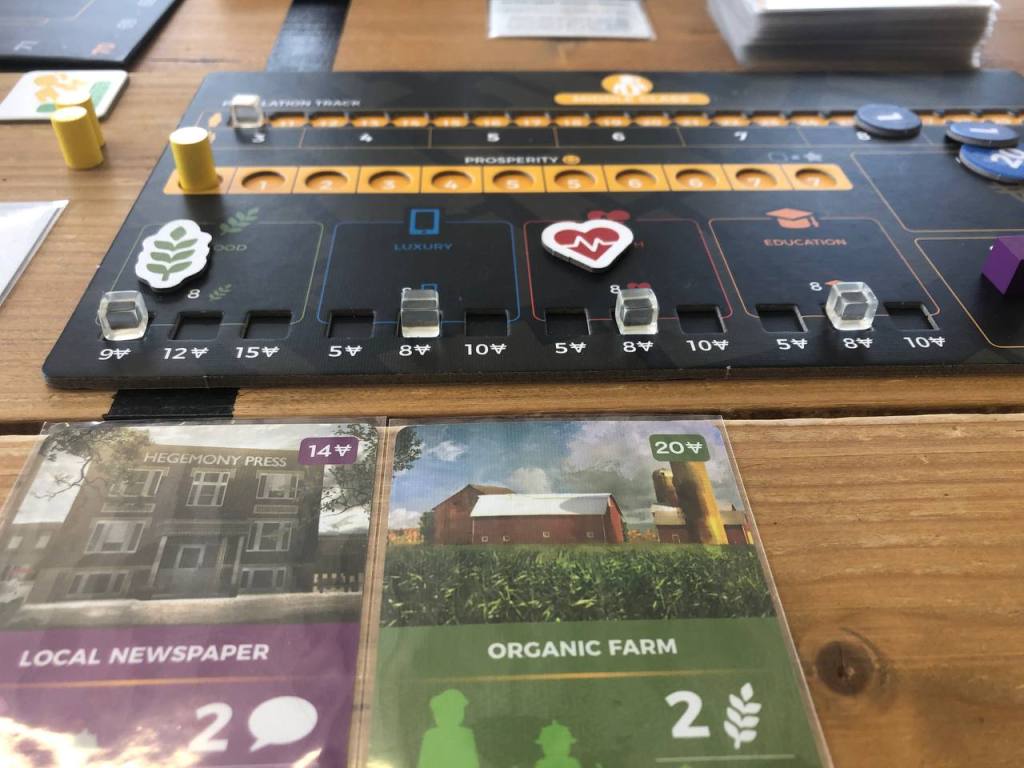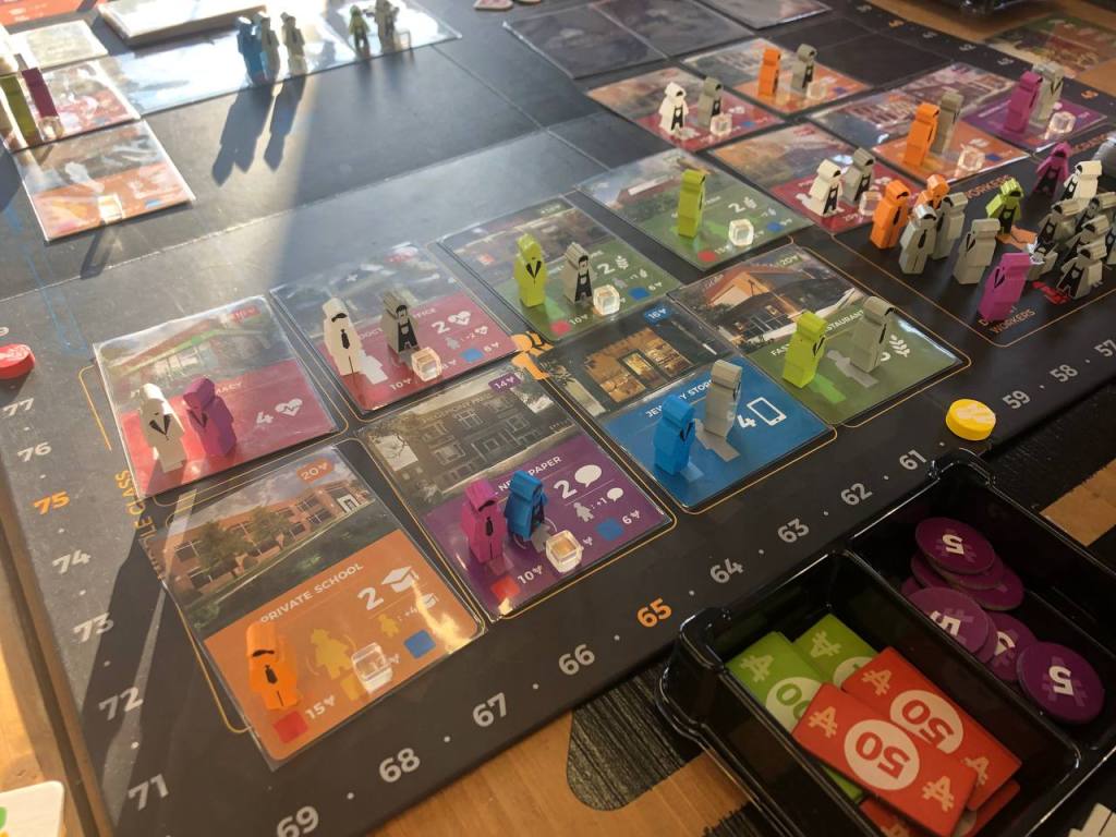 Играли полным составом, все кроме хозяина коробки в первый раз. Я за средний класс, Аня на капиталистах. Игра пугала количеством правил, но на деле все оказалось довольно просто. Возможно государство со стороны показалось чуть сложнее. Задача капиталистов — достать как можно больше денег за раунд, поэтому каждый раунд просто решаешь вопросик, как это сделать наиболее эффективно. Аня поначалу осваивалась, а под конец хорошенько разогналась, мне кажется, что если бы был еще раунд, то обогнала бы всех. За просто народ по факту нужно как можно дешевле покупать здоровье, образование и роскошь, чтобы апгрейдить уровни благосостояния, на этом наш победитель наварил больше всего очков. За средний класс схема примерно та же, я все надеялся откопать какой еще интересный способ фармить очки, понастраивал себе зданий, но по факту схема та же — меняй деньги на ресурсы, а ресурсы на ПО. У государства ситуация со стороны показалось более сложной, не знаю как другие, а я его старался контрить и не брал его подачки, вроде как это сработало.