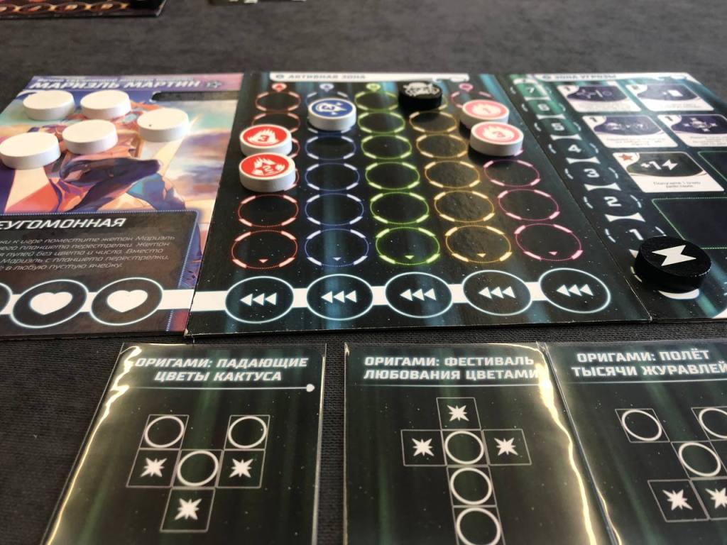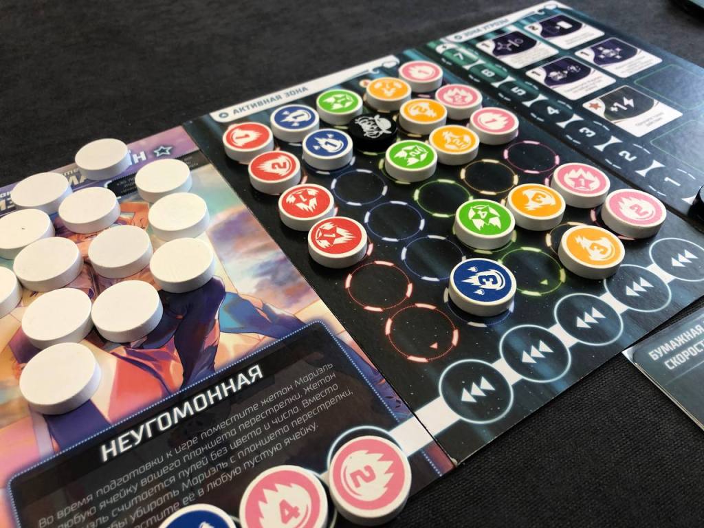 В игре мы тянем жетоны из мешочков, размещаем их на планшете, и если цифры ведут себя плохо, то получаем урон и проигрываем. Первой фишкой игры является реалтайм, каждый раунд длится три минуты, а музыка из приложения добавляет атмосферы, да и тайминг мне показался подходящим, обычно как раз этого времени хватало впритык, чтобы все успеть, что хочешь за раунд. Второй фишкой можно назвать уникальные свойства аниме-девочек. Это очень напомнило мне неизвестную планету: в нее садишься, чтобы посмотреть как работает очередная планета или планшет корпорации, хотя базовый геймплей простой, так и тут, при простом базовом геймплее интереса должны добавлять персонажи. Ну и в итоге у нас в партии было несколько интересных персонажей, а несколько прям проходных: хост посоветовал нам брать простых для первой партии, Аня взяла такого и в итоге ей было супер скучно. Так что поменьше слушайте хостов. Берите сразу сложное.