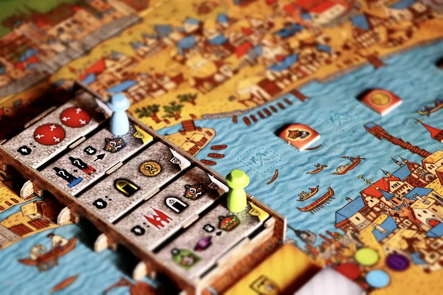 Добрался наконец-то до, наверное, самой желанной евроигры за последние годы. Уж привлекала она меня по тематике и оформлению. В Трикерионе, кто не знает, вы играете за фокусников, которые готовят фокусы и дают представления. В начале каждого раунда вы будете взакрытую выбирать действия, назначая на них фокусника и его различных помощников, а затем по очереди действия будете выполнять. Зоны для действий тематичные и довольно простые — можно учиться новым фокусникам или нанимать себе новых помощников на площади, можно покупать всякий хлам на рынке для выполнения фокусов, можно у себя в мастерской готовить фокусы к представлению и можно собственно в театре давать предствавления. Еще есть кривая улочка, где к каждой зоне действий можно взять какие-то интересные тумба-юмба карты.