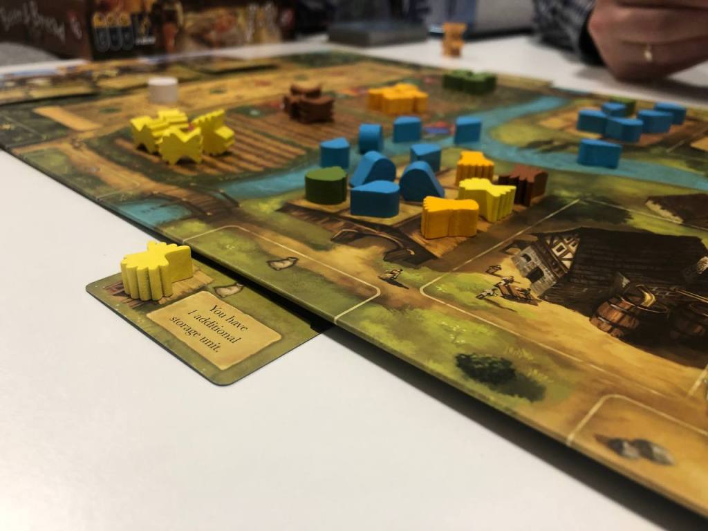 Опробовали новую евродуэльку. На протяжении 4 раундов будем разыгрывать карты (иногда их еще и дрифтить) тремя способами: усиления, сбор ресурсов, выполнение заказов. Надо планировать ресурсы под заказы, думать какие карты уведет соперник и вовремя и правильно усилиться. Сыграть удалось даже дважды, и если после первой партии впечатления были скорее ровные, то после второй игру распробовал чуть получше. Реально интересно планировать как разыграть карты и пробовать искать победную стратегию. Интересно, что в конце партии отдельно считается пиво, отдельно хлеб и твои очки — это наименьшая цифра, то есть упороться в одно не получится, надо держать баланс, и от этого иногда приходится интересно извращаться.