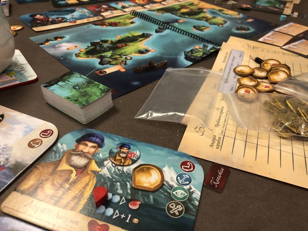 — Карты рынка. Мы, наверное, прокрутили 2/3 колоды рынка и особо чего-то супер интересного там нет, оружие, ну немного сильнее, чем базовое у некоторых персонажей. Возможно, самые интересные запрятаны в картах приключений, а найти там чет осознанно, само собой не выйдет. Можешь плыть за три девять земель по квесту и получить в награду 3 монеты, а можешь 6 опыта на ровном месте.