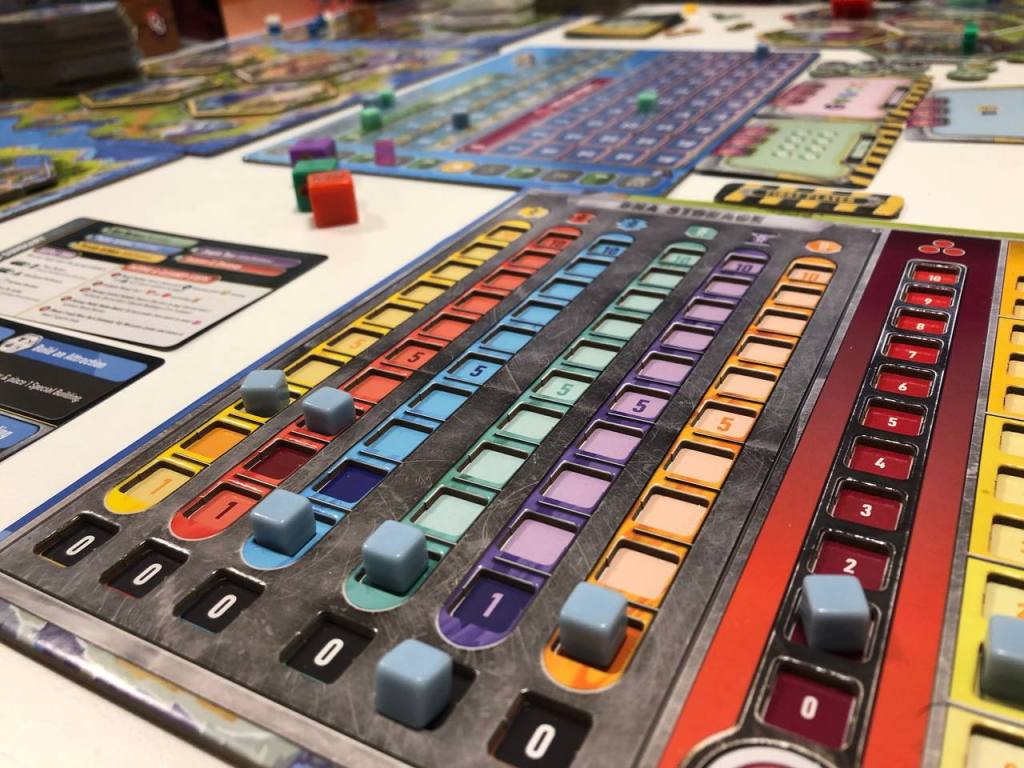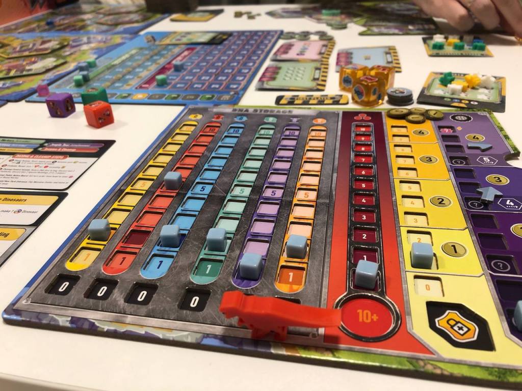 Довольно внезапно сыграл еще вот это вот диночудо. В Игре мы строим свой динопарк, водим экскурсии, выводим новые виды динозавров и так далее. Все довольно тематично. Из-за того, что парк развивается с помощью больших гексов с разными свойствами, игра напомнила субурбию. Но по факту, тут мы в начале раундов получаем 9 рабочих разных цветов и потом их распределяем в 2 фазы, сначала по очереди на общие действия, а потом параллельно оставшихся у себя на планшете. Немного похоже на паладинов, но тут планировать и думать еще сложнее, потому что думать нужно в обратном порядке: так, мне нужно 2 динозавра еще тут, для этого мне нужно вот такие ДНК, для этого нужно пойти сюда, и так далее. По мере игры стало проще и понятнее, все-таки первая партия. После того как всех рабочих распределили, устраиваем экскурсии, при этом по местам, где проехались на машине мы размещаем маленькие циферки, которые снижают уровень впечатлений на будущие экскурсии — игра не позволяет использовать много один и тот же движок. Ну или по крайней мере подталкивает к разнообразию.