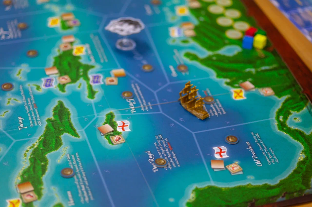 Следующей в день песочниц мне показывали старушку про пиратов. Играли по сути втроем, Аня только правила послушала и уехала по делам. Каждый ход начинается с того, что вы крутите прикольный компас, чтобы понять, куда дует ветер. Ветер передвигает бурю, и кому-то может быть атата. Затем вы читаете события, события прям жесткие, постоянно спавнятся NPC, постоянно кто-нибудь вступает в войну или начинается какой-нибудь длительный шторм, так что нужно прятаться по бухтам. А потом совершаете до трех действий. Чтобы побеждать, надо получать победные очки, за это надо закрывать всякие квесты, распутывать слухи и закапывать добытое золото на своем родном острове. Если вдруг в морском сражении или из-за погоды ваш корабль сломался, то вы просто берете себе нового капитана и новый корабль и продолжаете партию.