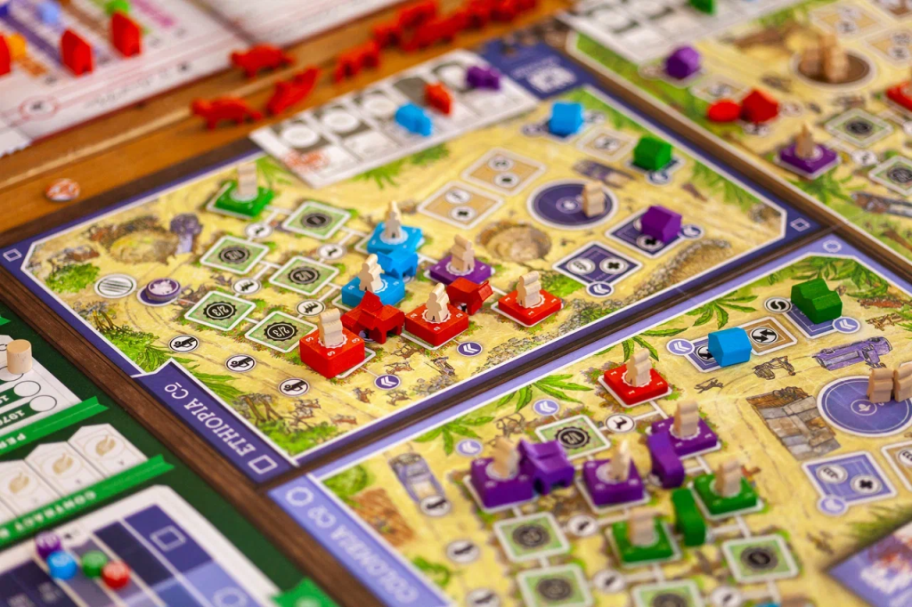 Собственно, как стало понятно по тексту прошла Минская версия пятилетия клуба. Если в Вильнюсе мы соображали на троих, то в Минске собралось суммарно за два дня около 30 человек (кто-то был в субботу, но не был в воскресенье и наоборот). Соревновательный элемент был только по Killteam, были полуфиналы и финал сезона. В остальном, были просто лайтовые различные партии. Кроме кольца-легенд запада-солнца-мерчантов и спартака на столах были замечены также следующие игры: Фолаут, Кофе трейдерс, Кемет, Немезида, Покорение Марса, Эклипс, Хуанхэ и Янцзы, УА3, Арнак с допом, новые Замки Бургундии, Брасс Бирмингем, Гегемония, Тираны Подземья, Королевство Кроликов, Чужая планета, Irish Gauge, Нусфьорд, Битоку и One Night Werewolf. Возможно, когда-нибудь Тарас поделится, как это пятилетие прошло для него, ведь кроме игры, он еще прочитал крутой внутряковый стендап. На фото редкие Кофе Трейдерс.
