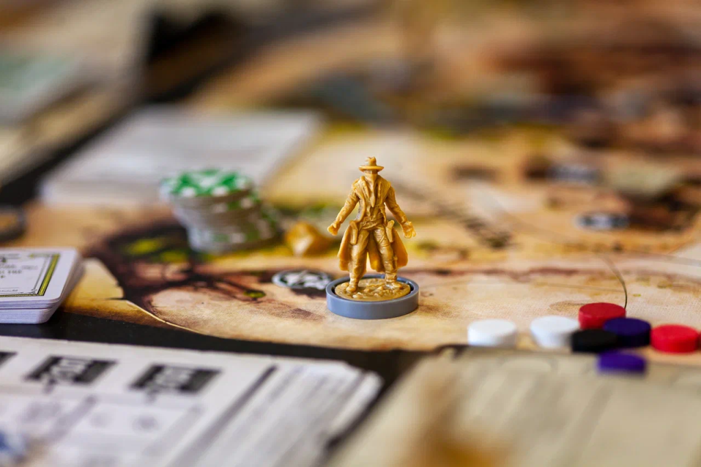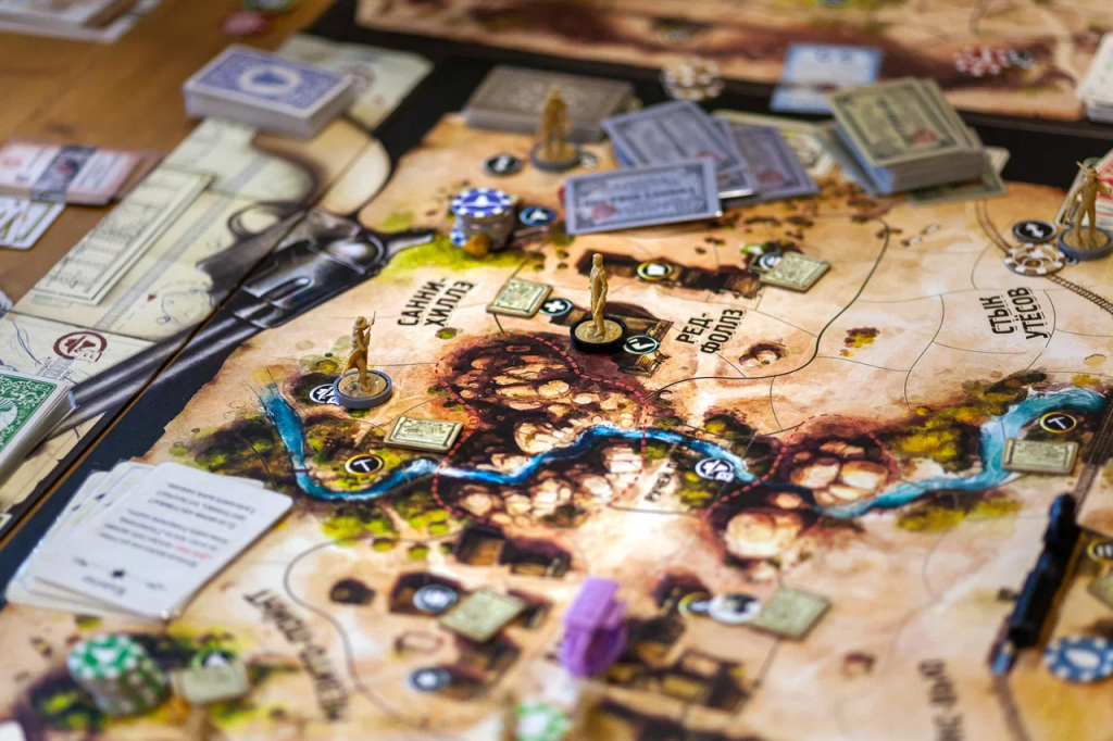 Так как составляю расписание я, то себя я само собой не обидел. Первый день у меня был день песочниц. К новому дополнению Высокие ставки я привез еще нелокализованное Blood Money и мы поехали приключаться на четверых. Высокие ставки добавили дополнительное поле, передвижение поезда, азартную игру альтернативную покеру, трек картежника, по которому можно двигаться и еще того-сего. Мне из этого контента больше всего понравилось доп поле, там разбросана куча жетонов с плюшками, нужно было просто приходить в локацию и скидывать кучу карт с руки, чем я и занимался.