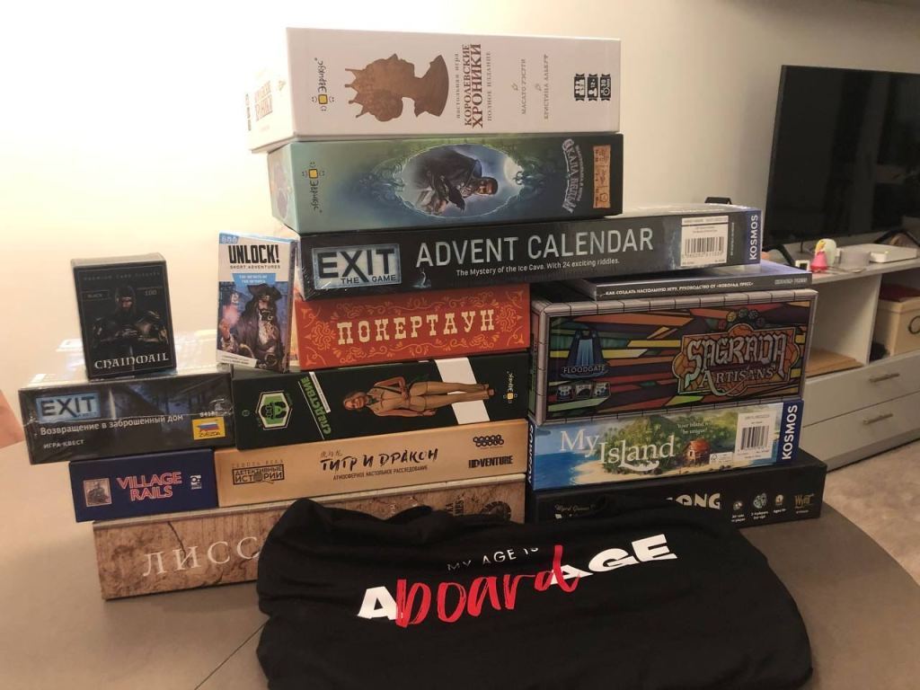 Собственно др клуба всегда очень рядом с Аниным днем рождения, да еще и некоторые предзаказы доехали, так что мы с Аней прям с россыпью игр вернулись в Вильнюс. Доехала к нам Саграда Легаси, до этого мы купили Вагрантсонг, а Ане на др я подарил Скалу Ведьм, а Аня выиграла на др клуба Королевские хроники, а я Village Rails. Еще приехал доп к Арк Нове, а я спонтанно купил тут еще Fit to Print. Также доехал заказанный ранее My Island. Можно добавить к этому парк экзитов и детективов, а также привезенный для Дениса Покертаун, вот и получается гора настолок, до конца года точно есть чем заняться. В принципе, до конца года в планах купить разве что доп к Скале Ведьм, а так вроде до конца зимы точно есть чем заняться. Если только вдруг что-то спонтанно не купим как это бывает.