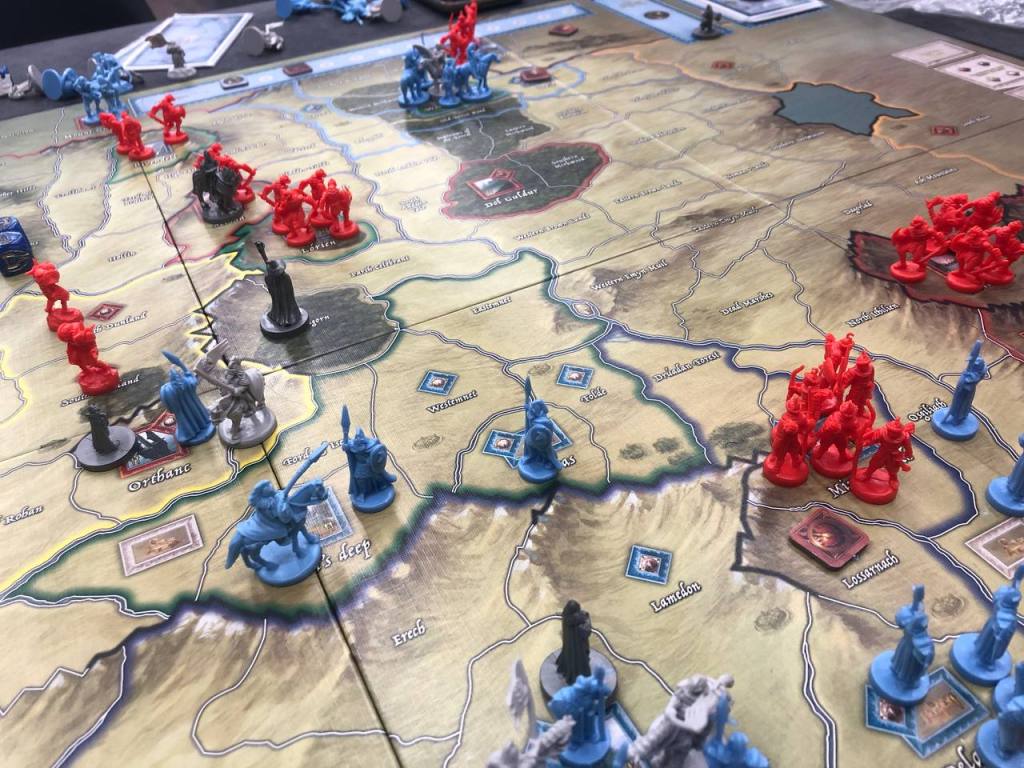 Когда Аня уехала, мы остались с Димой из Бороды вдвоем, время было, но мои игры из списка на двоих не особо подходили, нужно было больше игроков, так что решили засесть за Войну Кольца. Я бы хотел допы попробовать, но Дима меня отговорил, так что сыграли в чистую базу. Я играл на Тьме, пытался снова победить по охоте, но не везло на жетоны и на карты охоты, поэтому в какой-то момент пришлось переобуться на военную победу. Дима тоже не терял времени по войне даром, и в какой-то момент отжал у меня Гору Гундабад, а потом и Ортханк. Дима вообще хорошо играл, довольно быстро получив свои дополнительные кубы. Но и я не первый раз играю, поэтому хоть и не раз и ошибался, все равно общий план по отвлечению внимания соперника удался. Я собрал огромную армию в Ортханке, что заставило Диму сконцентрироваться на Рохане, но параллельно с этим основные мои битвы происходили совсем в других местах, армии из Мордора вообще почти не вышли и основные очки мне приносили Харадримы, то тут, то там.