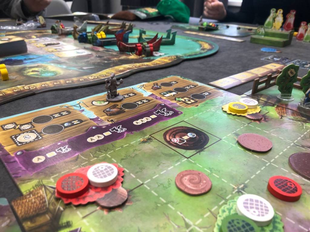 На следующий день отправились на переговоры в Минский настольный клуб Мерлинова Борода. У меня был целый список игр, которые хочу попробовать, но времени на троих было после переговоров только на одну, засели за Бухту. Ожиданий у меня особо кроме того что это красиво и асимметрично не было, но по факту все равно оказался разочарован. Вроде взяли не самых простых персонажей, но все равно действия, которые мы все выполняли, были супер простые и во многом скучные. Я играл за драконолога, и по факту просто на протяжении каждого раунда выкладывал кучу жетончиков на поле, потом производил кучу драконов и их продавал. Аня за алхимика шарами манипулировала, а Дима кровати выставлял да пиво варил. Не знаю, насколько интереснее игра за других персонажей, но тут минимум 2 из 3 мне показались супер унылыми, хозяин таверны еще более менее. Задумка у игры — супер, но явно она сделана не для опытных игроков. Нам бы чего такого же, но посложнее.