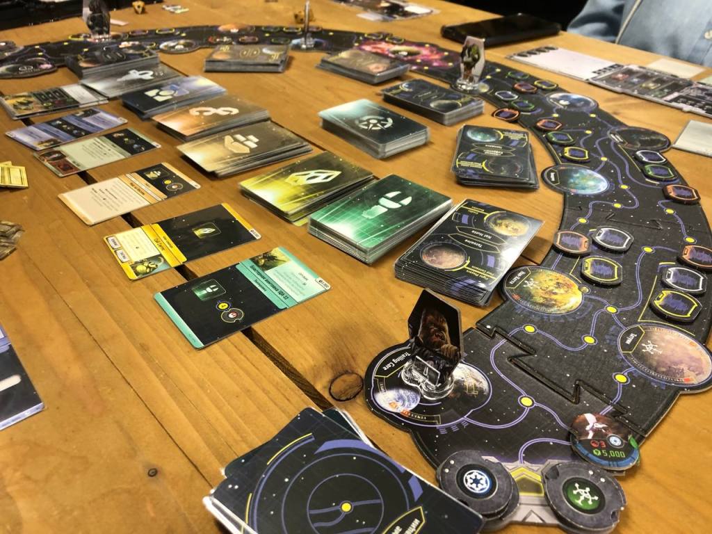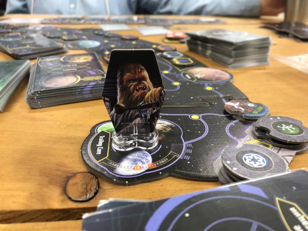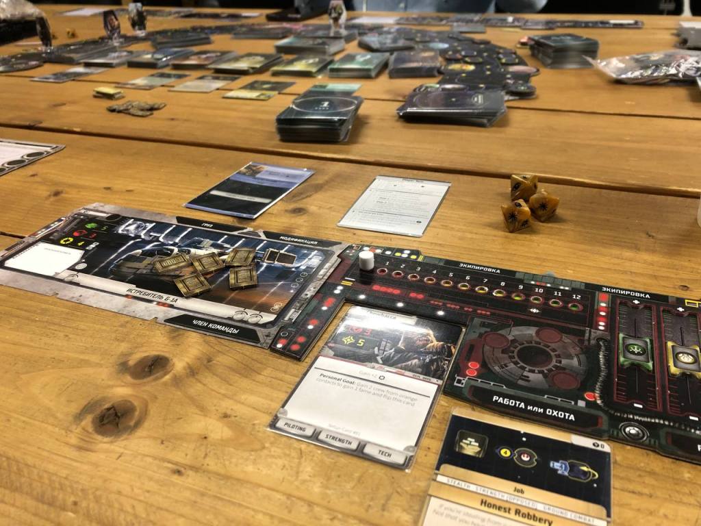 Финалить первый день песочниц мы стали кольцом с допом. Кроме допа еще замешали что-то из фанатского контента, вроде бы пару квестов, а также взяли колоду, из которой надо рандомные события тянуть, если далеко летишь в свой ход. Колода прикольная, понравилась. Ну и само собой, сердцем игры стал официальный доп. В нем на самом деле не так много прям всего, хотя цена его что-то около 60-70 евро. Основных фишек как по мне в нем несколько — появились оранжевые персонажи контакты, кольцо стало кольцом и теперь можно летать по кругу, для этого нужно читать определенные карты контактов, еще теперь можно играть за Чубакку, чем я и занялся. Также добавили в игре больше взаимодействия, некоторые квесты могут исключать друг друга, а некоторые требуют двух игроков.