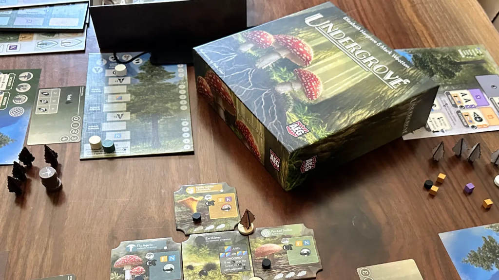 От животных к грибам. Тоже игру завезли в альфу на BGA, поразбирался, поиграл. Автор Крыльев как будто все ищет новую успешную игру и все в природных тематиках — бабочки, лисы, вот, теперь грибы, но как будто бы не особо находит. Тут мы играем за деревце, которое с грибами вокруг вступает в симбиоз, у грибов всякие свойства рядом, но не такие интересные как у птиц в крыльях, а более одинаковые. Задача наша, само собой, плодится, развиваться, немного ареаконтролить и не забывать фотосинтезом заниматься. Короче, долго про игру говорить не хочется, не понравилась мне. Какая-то слишком пресная в плане механик, хотя тематика и реализована довольно ладно.