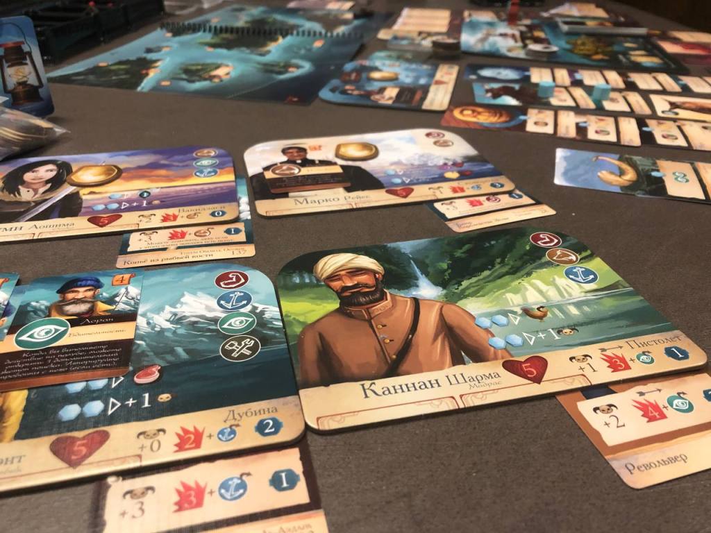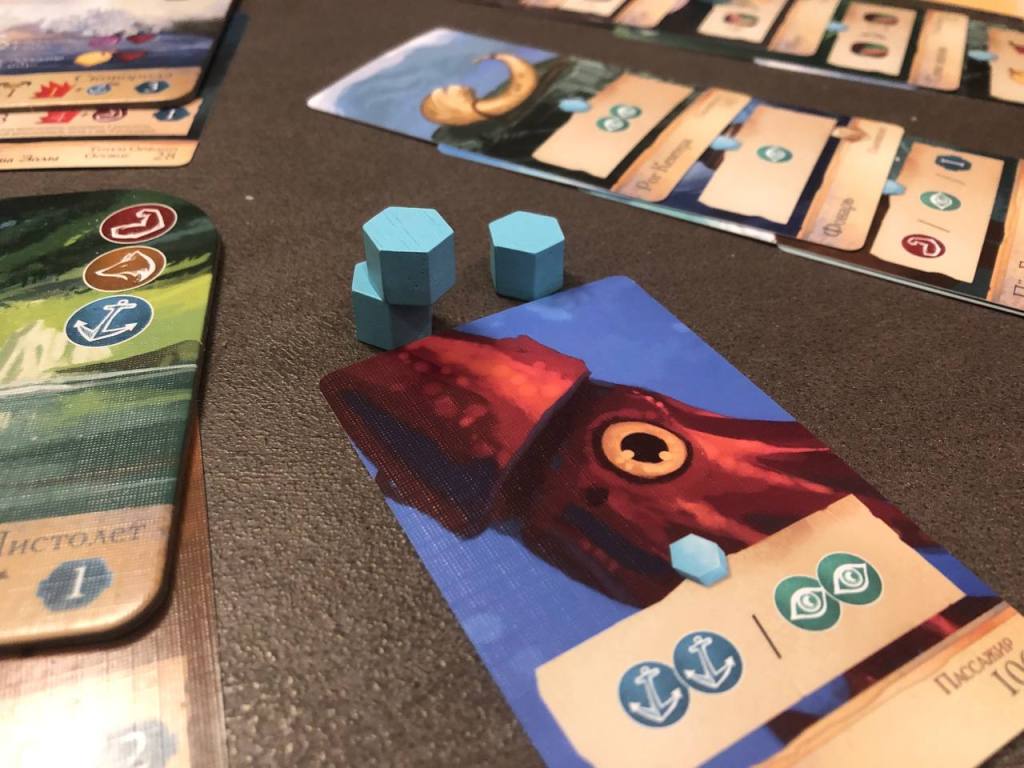 Как таковых партий в игре нет, по сути вся игра это одна большая партия, которая разделена условно на 3 блока, в каждом из которых вы делаете по 18 ходов. Сделали 54 хода — игра закончилась. Мы оставляли игру на столе разложенной и иногда делали по 2 хода в вечер, а иногда сразу с десяток. Если не везет и приплывешь в неправильные локации, то игра двигается довольно быстро. Дольше всего мы застревали по времени на локациях с подземельями, но там было довольно интересно.