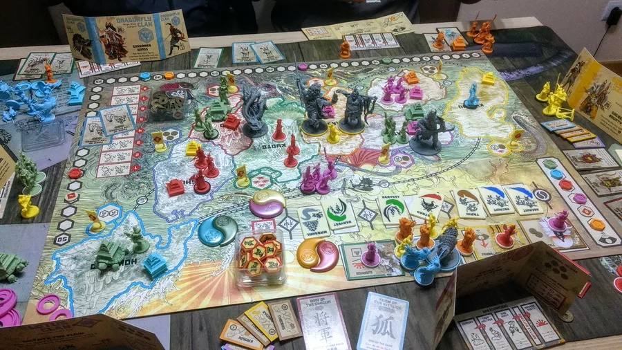 3 место. Восходящее солнце. Со временем понял, что это все-таки лучший контроль территорий на мой вкус. А если это так, то такое вполне можно держать в коллекции: и база, и допы продаются. Единственная проблема, будем ли мы собирать партии на такое, ведь с текущими сопартийцами чаще играем во что-то сюжетное или в евро, контроли территорий и прочие игры со злым взаимодействием заходят не очень. Поэтому в вишлист игру добавляю высоко, но вероятность, что куплю небольшая. Пылесборников и так хватает.
