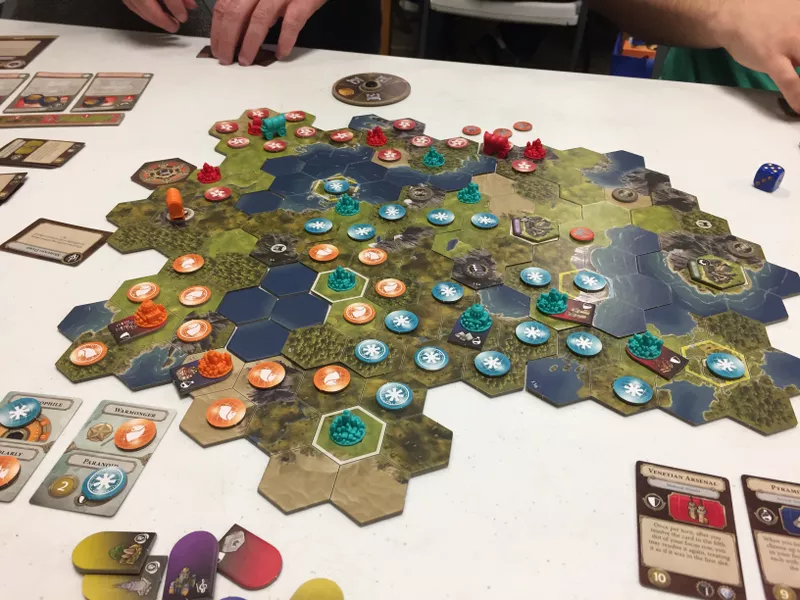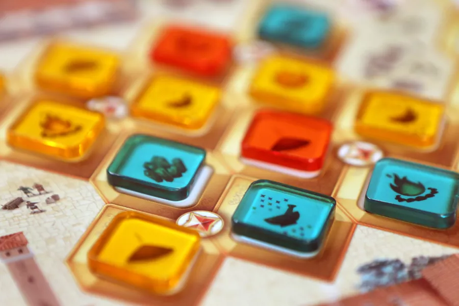 4 место. Five Tribes. Пять племен как залетела в прошлом году в мой топ-10, так вряд ли в этом году его покинет. Игра визуально выглядит как месиво, но играть в нее по-прежнему пару раз в год интересно. Со всеми дополнениями я бы ее в коллекцию вполне добавил. Но, с учетом, этих ваших трендов на переиздания и делюксы, возможно, есть смысл подождать какой-то новой алл-ин версии этой игры. Кстати, один из редких случаев, когда не сильно заходящая мне восточная тематика в игре, не помешала полюбить игровой процесс.