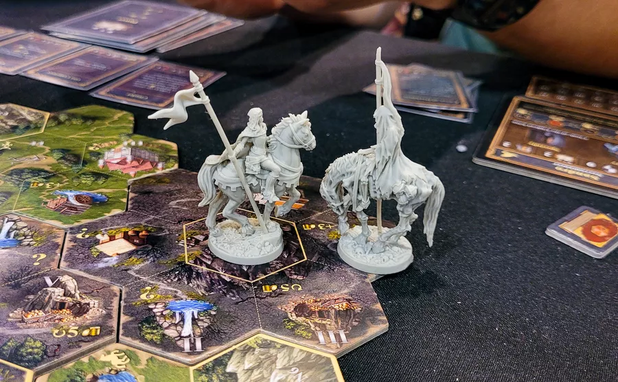 Dwellings of Eldervale. Игра очень привлекала своим продакшном, и беглым взглядом, механиками. Но беглый взгляд на то и беглый. Изучив игру во время партии детальнее я увидел, что мне не нравится в ней почти ничего кроме мощных и интересных карт. Миплплейсмент скучный, фракции тоже не особо как-то влияют, а стоит это все дело очень прилично. В итоге купленную заранее миниатюрку минотавра подарил Саше и Пронастолок, надеюсь, ей игра зашла побольше.