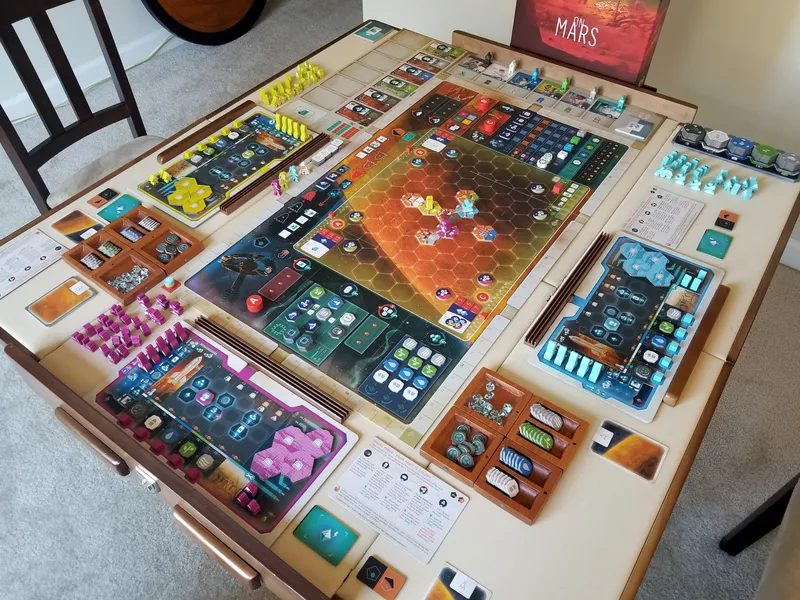 Добрались до Ласерды. На самом деле в итоговом топ-50 только 2 игры гранд мастера. На Марсе пережила во времени и Канбан и Виньос, и плотно закрепилась на высоте. Концепт очень необычный, механически все работает здорово, реиграбельность за счет контента выше, чем во многих других играх автора, а наличие кооперативного дополнения вообще делают игру не похожей на другие евро. Так что На Марсе мне как-то запомнился и хочется его включить в топ-10. В коллекцию же не беру, потому что считаю, что нет смысла держать больше двух игр Ласерды на полке.