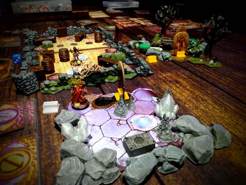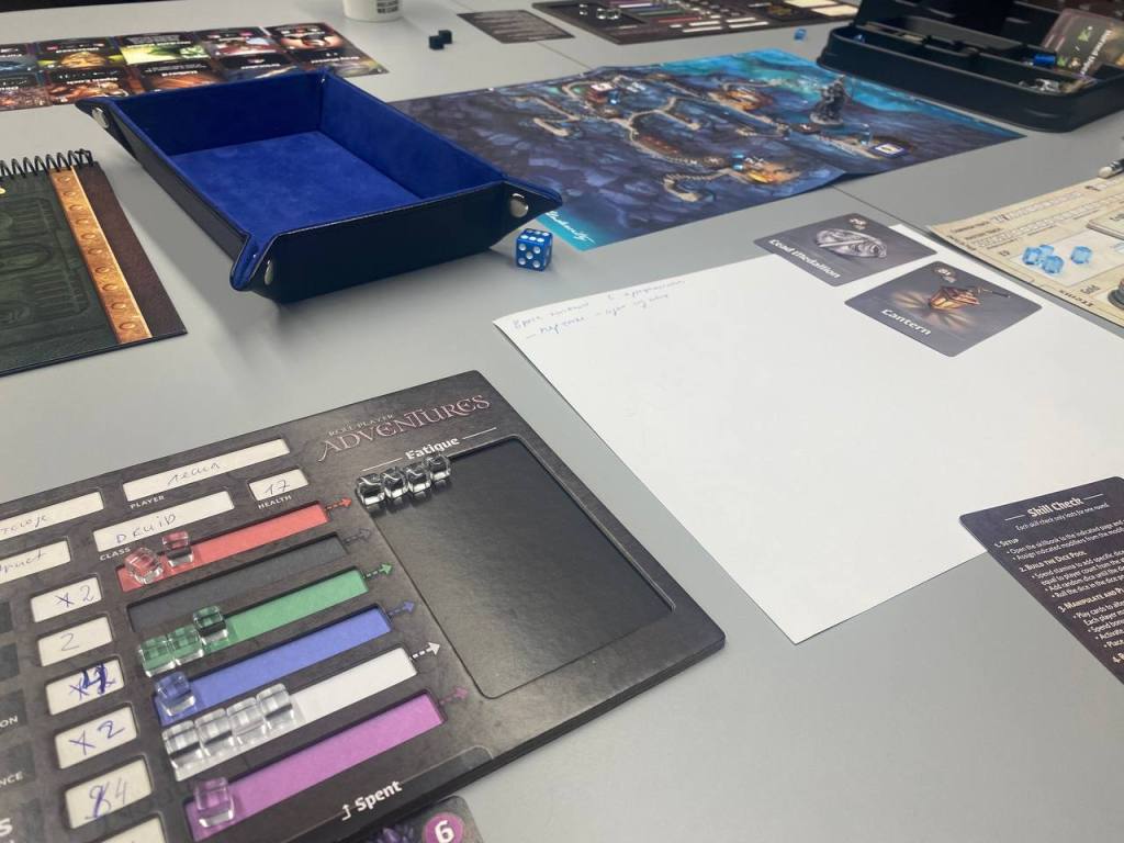 Там лежит Roll Player Adventures с дополнениями. Игру подарил себе на день рождения в этом году и вот в конце года с друзьями до нее добрались. Прошли уже 4 сценария, получил от геймплея почти то, что и ожидал. Разве что хотелось бы, чтобы выбор расы и класса тоже на что-то дополнительно влиял в сюжете, но это, тогда, возможно, сильно бы увеличило количество контента. Тем не менее, даже с этим недочетом игра еще не раз будет разложена на столе: впереди еще больше 10 сценариев в базу и доп.