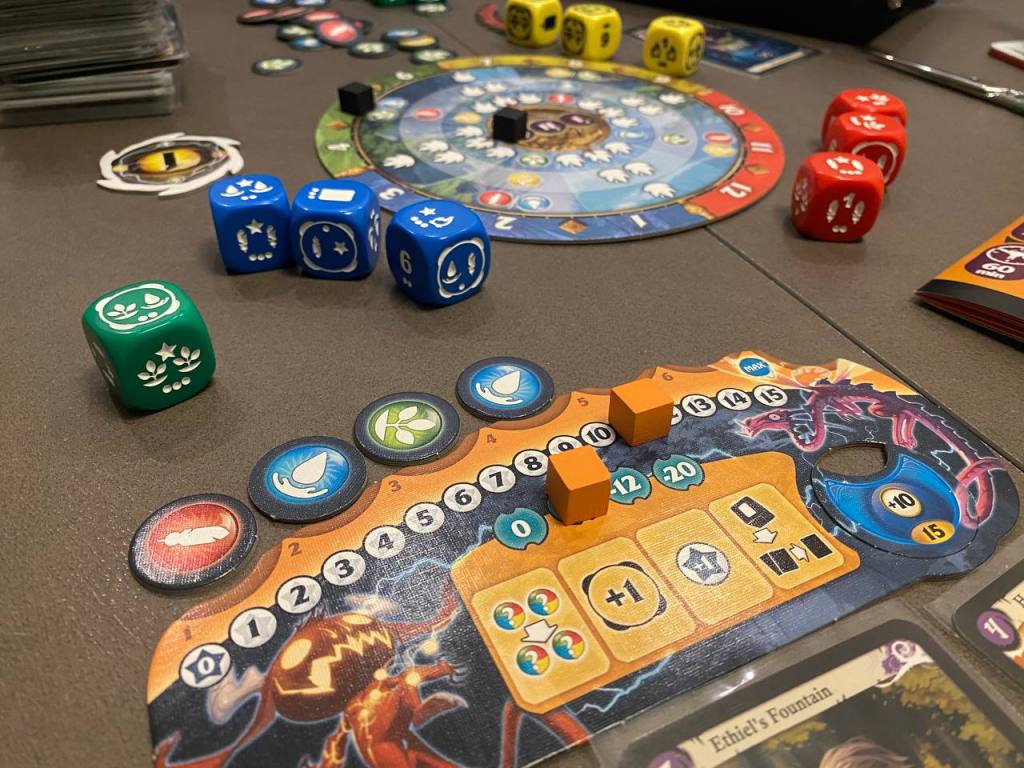 Еще вот Сезоны случайно приобрел себе с рук. Повелся на то, что это база с двумя допами. Теперь колода карт с дополнениями простирается до небес, что может открыть в картах невероятные комбинации. Сами допы на самом деле не сильно меняют геймплей. Кроме новых карт — на партию выходит еще что-то вроде «особого правила партии», там есть прям необычные, но не кажется, что мастхэв. Ну и еще разовую способность дополнительную получаешь в начале, что дает немного асимметрии, но тоже не кажется каким-то сильным изменением. Так что это все те же старые добрые сезоны, с приятными короткими дуэльными партиями, красивыми кубами и с неудобным треком для подсчета очков.