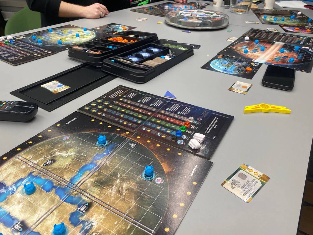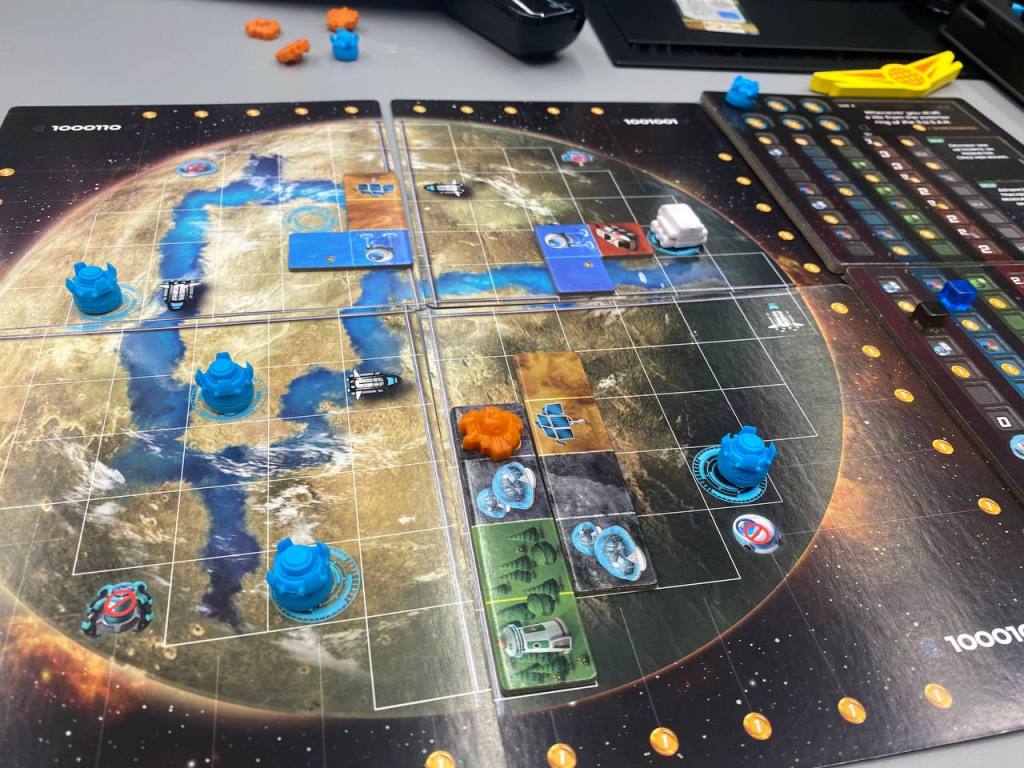 Я свою коробку продал, но товарищ вписывался в кик и вот ему приехала база с допом. Геймплей все тот же, мне особенно было интересно посмотреть на доп. Когда я прочитал описание дополнения в первый раз, я не задумываясь продал свою копию игры, потому что базу не сильно хотелось прям заигрывать еще, таскать на игротеки не удобно — большая коробка, а дополнение не вдохновило. Так на деле в какой-то мере и оказалось. Дополнение добавляет парочку модулей, из которых самый интересный — наверное, это модульная планета и корпорация. Но по факту — это всего одна новая планета и одна новая корпорция, которые не смотря на модульность не будут давать иного геймплея от партии к партии.