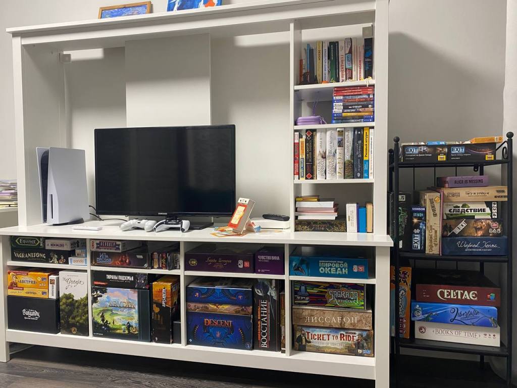 На самом деле новостей не очень много. По разработкам настолок новости не очень. Просчитанные цены за текущие два прототипа устраивают только при тираже 5000 штук, но это слишком большой финансовый риск для ноунейма, так что буду пробовать продавать мелкие разработки все-таки европейским издателям, а не издавать самостоятельно. Однако эти же цифры открыли потенциальные дополнительные возможности для одного краудфандинг-проекта, в ближайшие пару недель станет понятно, есть ли там свет в конце туннеля. Корпоративный заказ тоже отвалился, но может еще кто-нибудь передумает. Тут особо картинок не приложишь. Поэтому вот вам фоточка полок.