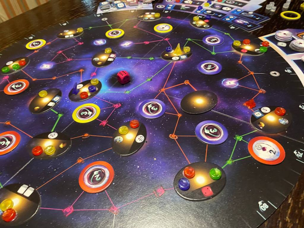 Еще одна причина посетить клуб была сыграть Пульсар. Это уже был не мой вишлист, но затем мы и хотим в клубы, чтобы трогать вишлисты друг друга. Пульсар, если объяснять кратко, то это, хм, ну представьте что в Замких Бургундии вам надо драфтить кубы после броска, а а за сами кубы вы можете летать, прокачивать технологии и всякое такое. Да, это вообще не замки бургундии, тут похожего только что кубы определенных значений используются для разных действий.