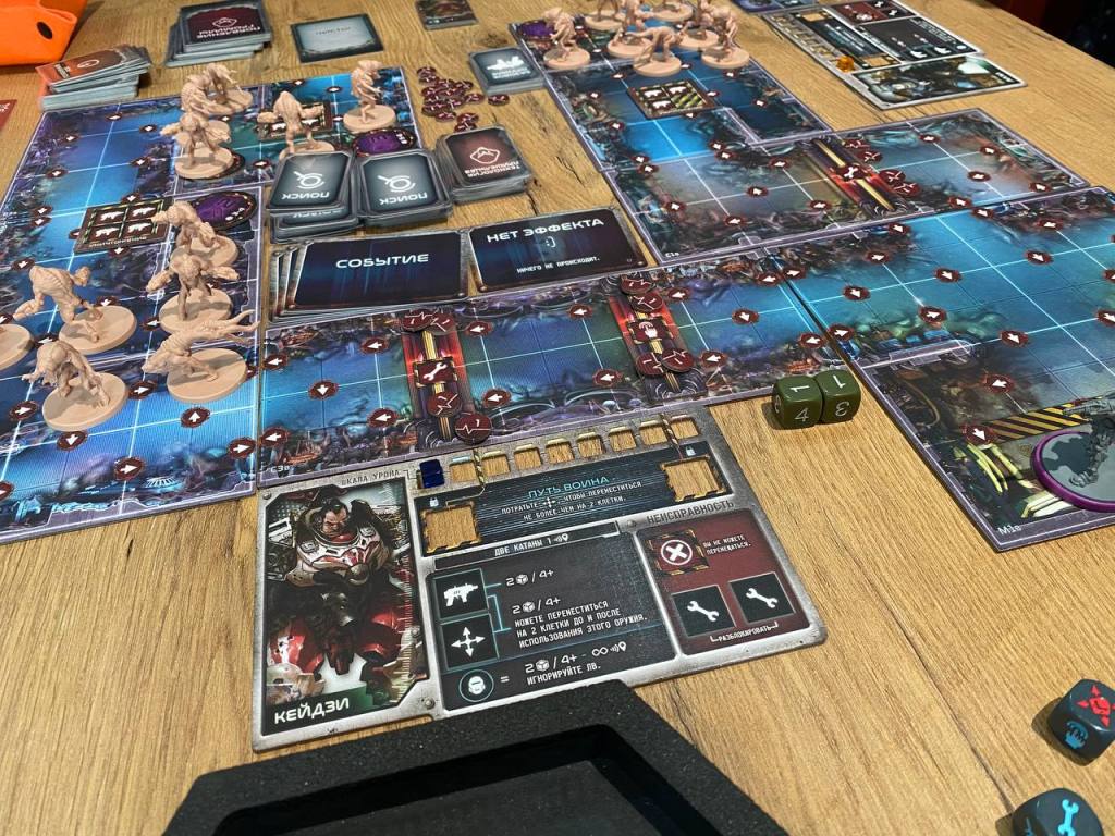 Еще. сыграл в это чистешей амери. Сразу знал, что игра мне не прям зайдет: не люблю реал-тайм, не люблю сеттинг сражения с монстрами, не люблю шутеры, но механически было интересно посмотреть как все реализовано. Мы играли с допчиком, в котором пришлось бегать по коридорам, плюс часть из игроков взяла себе персонажей из набора Грач, это более сильные персонажи, но не могущие добирать оружие из жетонов поиска.